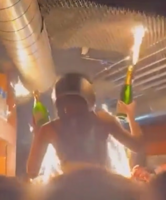 Os festeiros podem ser vistos dançando e torcendo enquanto uma garçonete de capacete é carregada pelo clube no ombro de um homem, segurando champanhe coberto com faíscas acesas.