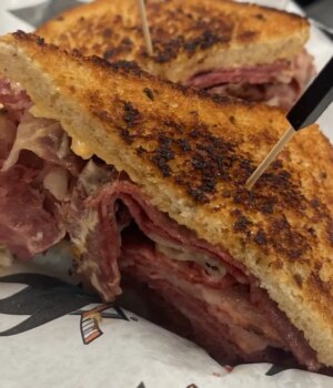 Cidade grande Ruben: Pastrami de peito, chucrute, queijo suíço, molho mil ilhas. Onde: Clube do Jumbo 113