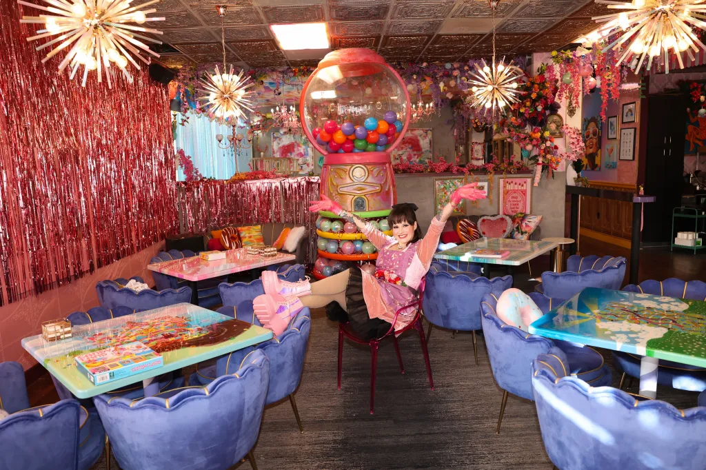 Os bancos têm formato de biscoitos Oreo e casquinhas de sorvete. Pirulitos estão pendurados no teto e decorações parecidas com doces revestem todas as paredes. Tons de rosa, roxo e azul algodão doce enchem o ambiente de capricho.