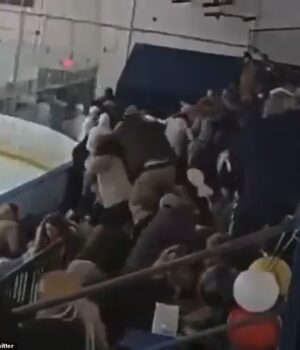Imagens de terror capturam o momento em que um atirador transgênero abriu fogo contra sua família em um jogo de hóquei no gelo, enquanto espectadores saltavam das arquibancadas para salvar suas vidas – antes que um corajoso espectador atacasse o atirador e o lutasse por trás.