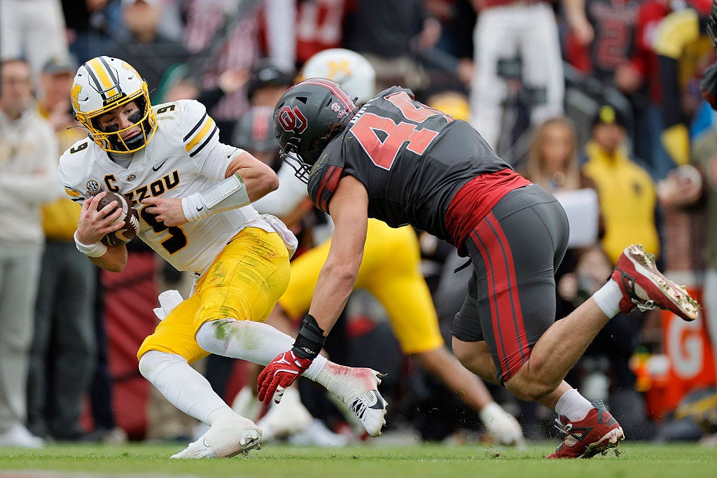 O quarterback do Missouri, Beau Prybula (9), tenta evitar Taylor Wayne, do Oklahoma, durante o jogo de 22 de novembro em Norman, Okla.