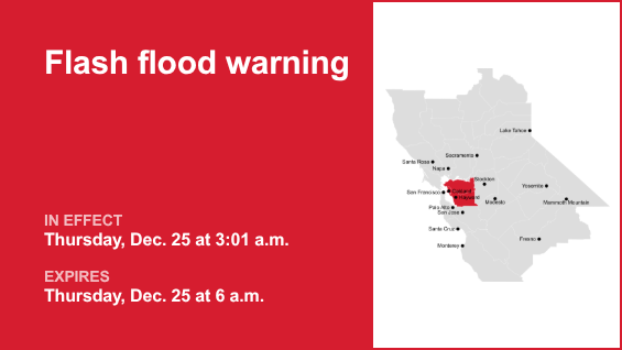 “Às 3h01, o radar Doppler indicou fortes chuvas em toda a área de alerta. Caiu 0,5 a 1 polegada de chuva. Inundações repentinas estão em andamento ou deverão começar em breve.” NWS São Francisco CA. “Inundações repentinas em pequenos riachos e riachos, áreas urbanas, rodovias, estradas e passagens subterrâneas, bem como outras áreas baixas e mal drenadas.”