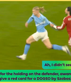 O oficial do VAR argumentou que Haaland puxou a camisa de Soboszlai depois A vantagem foi jogada, o meio-campista do Liverpool teve que ser expulso por DOGSO e uma cobrança de falta seria concedida fora da área, apagando o gol de Cherky do placar.