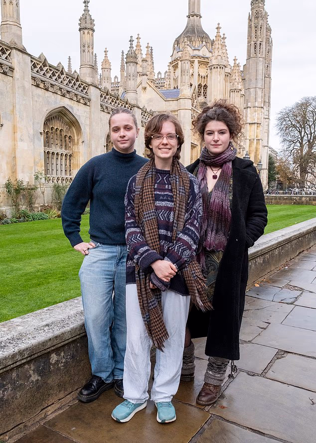As estudantes fundadoras da Sociedade de Mulheres da Universidade de Cambridge (CUSW), Thea Sewell, Serena Worley e Meave Halligan (da esquerda para a direita), estão protestando contra o apelo do Newnham College para permitir que homens biológicos se ‘identifiquem’ como mulheres.