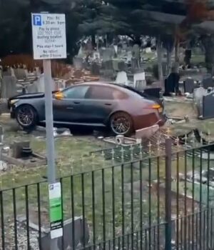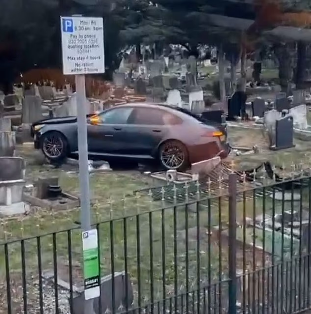 Um carro estava passando por um cemitério em Londres, deixando sua lápide quebrada e um terreno elevado.