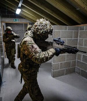 Soldados britânicos do Regimento do Duque de Lancaster limpam edifícios durante um exercício na Estônia