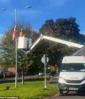 O vídeo mostra funcionários do conselho em veículos estilo Cherry-Picar removendo a bandeira dos postes