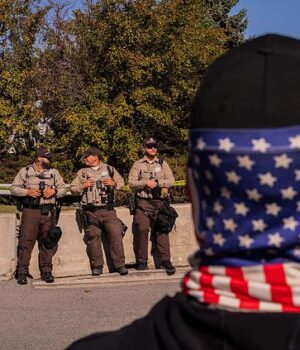 Um manifestante segurando a bandeira americana no rosto dos xerifes do condado de Cook fora das instalações de imigração e aplicação de tarifas no sábado no Broadview de Illinoi