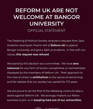‘As opiniões expressas pelas sociedades são próprias e não refletem a política universitária. A Universidade de Bangor permanece politicamente neutra e apoia a liberdade de expressão.