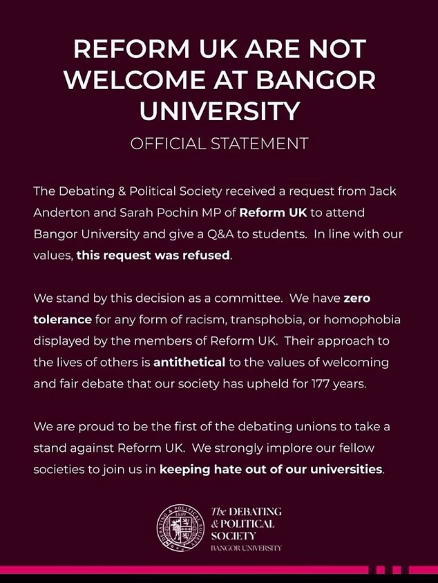Mas a presidente do Reform UK, Zia Youssef, disse: ‘A Universidade de Bangor proibiu o Reform e nos chamou de “racistas, transfóbicos e homofóbicos”.
