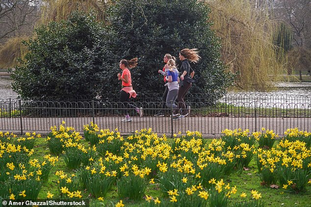 Corredores correm entre narcisos primaveris no St James’s Park, em Londres, na manhã de segunda-feira