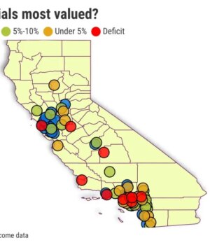 Minha planilha confiável revisou o scorecard do SmartAsset Renda de 2024 para famílias lideradas pela geração Y em 357 grandes cidades dos EUA – incluindo 77 na Califórnia. Os rendimentos desta faixa etária dos 25 aos 44 anos foram comparados com os rendimentos globais para calcular o pagamento do prémio millennial para cada cidade – ou, em casos raros, um défice problemático de rendimentos.