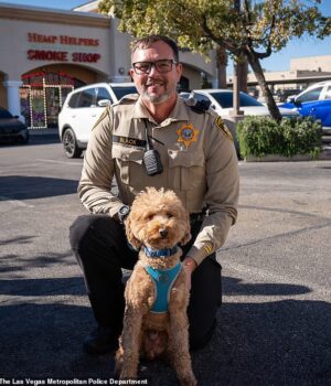 O policial de Las Vegas Skeeter Black adotou um amigo de quatro patas, apelidado de ‘Jet Blue’, escreveu o departamento no Facebook no sábado.