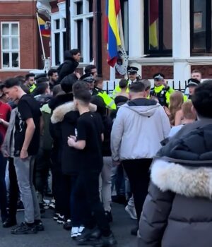 Enquanto isso, um vídeo mostra três jovens fugindo enquanto dois policiais os perseguem. Não se sabe se eles eram membros do partido.
