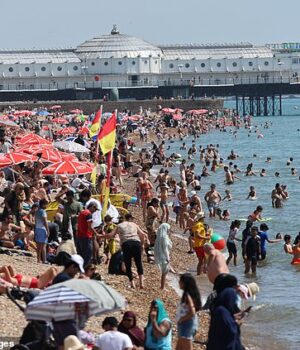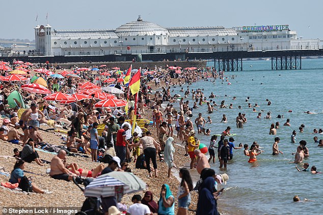 A Grã -Bretanha está prestes a ficar ainda mais aquecida que Barbados, com uma temperatura dos menos de 30 anos na Inglaterra e no País de Gales – em algumas partes do Western Midlands, incluindo a temperatura dos anos 30, atingiu 34 ° C (93F). Ilustrado: os passageiros da praia estão desfrutando do calor de Brighton Beach em 11 de agosto
