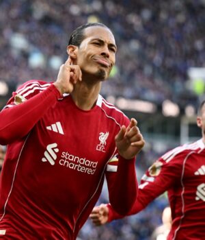 Van Dijk correu para comemorar e levou o dedo ao ouvido depois que Dominik Soboszlai cabeceou para gol nos acréscimos. Os torcedores da casa foram silenciados e ele informou que não podia mais ouvir suas vaias.
