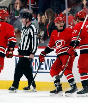 Ehlers, que assinou com o Carolina na entressafra depois de jogar 10 anos no Winnipeg, também deu uma assistência. Taylor Hall marcou dois gols e Mark Jankowski fez um gol e duas assistências. Alexander Nikishin e Andrei Svechnikov marcaram um gol e uma assistência, e Eric Robinson também marcou.