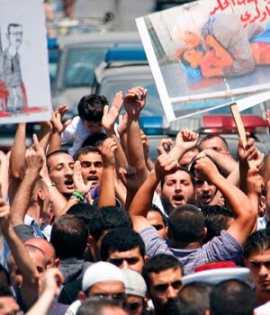 Crianças sírias carregam uma fotografia de Hamza al-Khatib, de 13 anos, em frente ao edifício das Nações Unidas em Beirute, em 2011 – activistas dizem que ele foi torturado até à morte pelas forças de segurança.
