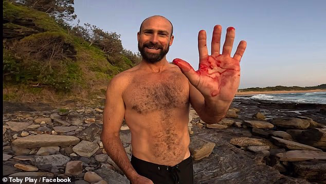 Paul Stanton mostra as mãos ensanguentadas após ser ‘atropelado’ por um tubarão enquanto surfava