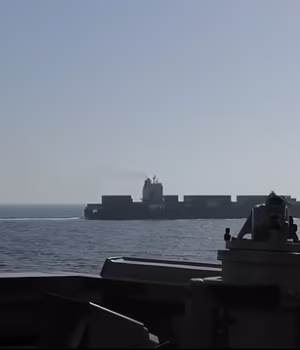 ‘Navio motorizado Tosca, Navio motorizado Tosca. Evacue sua sala de máquinas. Evacue sua sala de máquinas. Vamos desabilitar seu fogo”, diz o vídeo. Mais tarde, três tiros foram disparados, deixando um rastro de fumaça.