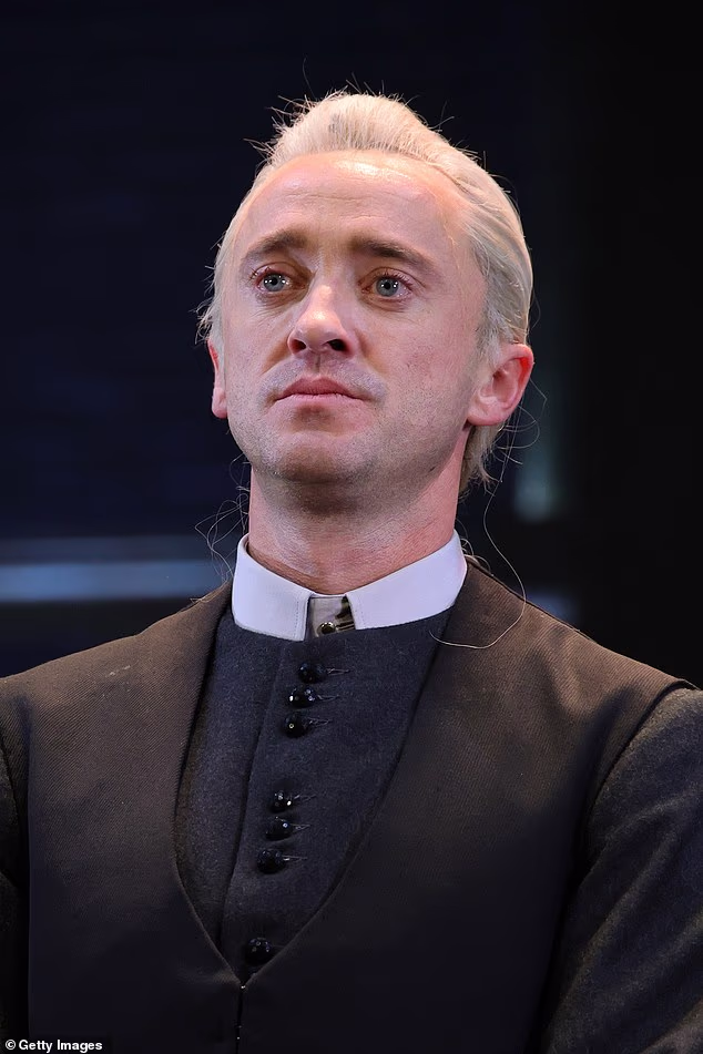 O ator, de 38 anos, fez sua estreia na Broadway em Harry Potter e a Criança Amaldiçoada no Lyric Theatre, com Tom emocionado durante a chamada ao palco.