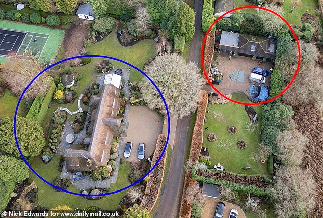 Lord Philip Harris, o magnata dos pisos conhecido como ‘Rei dos Tapetes’, avançou com a enorme garagem (à direita) a metros de sua casa (à esquerda) em Holmbury St Mary, Surrey – apesar de seus planos originais terem sido rejeitados.