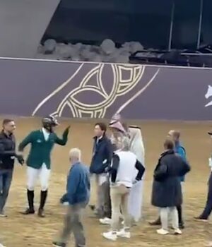 O marido medalhista de ouro olímpico de Eve Jobs, saltador, pulou do cavalo e ficou furioso com um trabalhador estável durante uma competição no Catar.