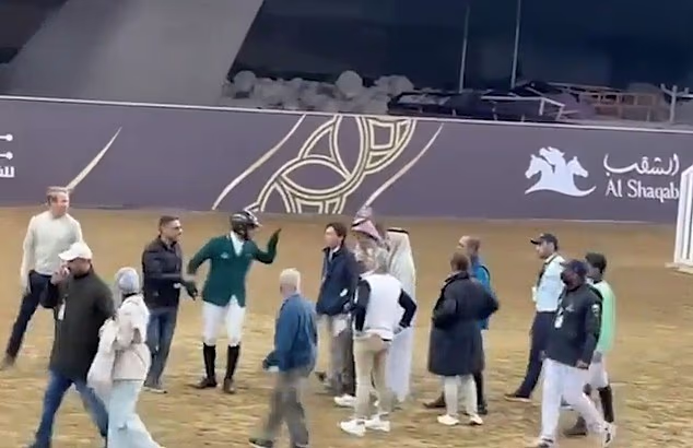O marido saltador de ouro olímpico de Eve Jobs (retratado com uma jaqueta verde) pulou do cavalo e entrou em uma briga furiosa com um trabalhador estável durante uma competição no Catar.