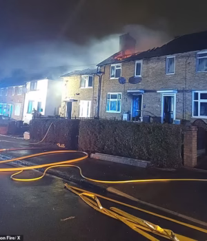 O fogo atingiu o porão e o primeiro andar da casa, causando o desabamento do telhado. Fotos do local mostram o imóvel destruído, com fumaça saindo de um grande buraco no topo do imóvel.