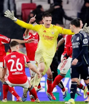 Momentos depois, o Estádio da Luz enlouqueceu enquanto os jogadores do Benfica corriam em todas as direções e Trubin encerrou o seu próprio ataque exuberante ao deslizar com os joelhos no golo decisivo num cabeceamento de bala.