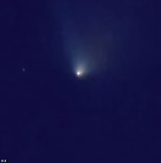 Após a interrupção, um grande brilho azul claro e roxo brilhou e permaneceu no céu noturno.