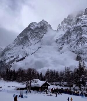 Imagens dramáticas capturaram massas de neve e gelo caindo em uma encosta íngreme perto do resort italiano de Courmayeur na terça-feira.