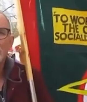 Os trabalhadores do metrô no protesto são vistos segurando uma faixa verde com uma borda vermelha e letras douradas: ‘Sindicato Nacional dos Trabalhadores Ferroviários, Marítimos e de Transporte – Filial Bakerloo’.