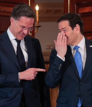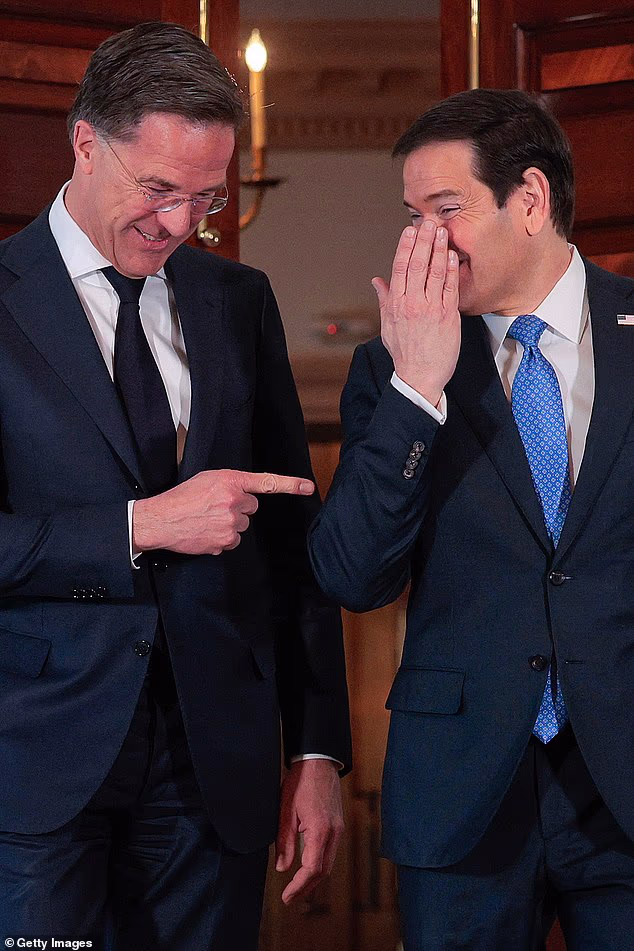 O secretário-geral da OTAN, Mark Rutte (foto à esquerda), e o secretário de Estado dos EUA, Marco Rubio (à direita), compartilham um sorriso na quarta-feira