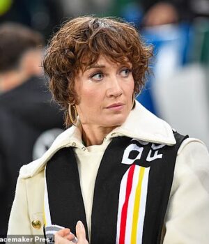 A cantora Carly Paoli usou um casaco com lenço alemão antes da partida contra a Irlanda do Norte