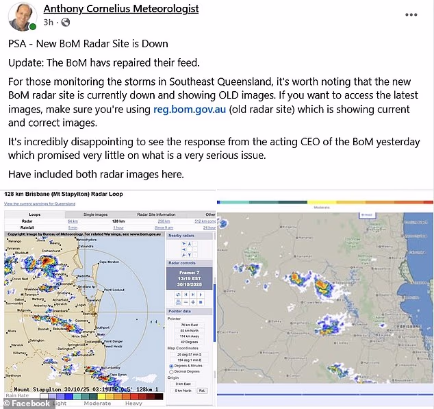 “Para aqueles que monitoram a tempestade no sudeste de Queensland, deve-se notar que o novo site do radar do BoM está atualmente fora do ar e mostrando imagens desatualizadas”, escreveu ele no Facebook.