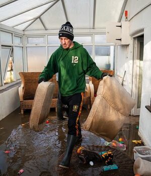 Sr. Vernon varre a água da casa em Axminster e salva o que pode