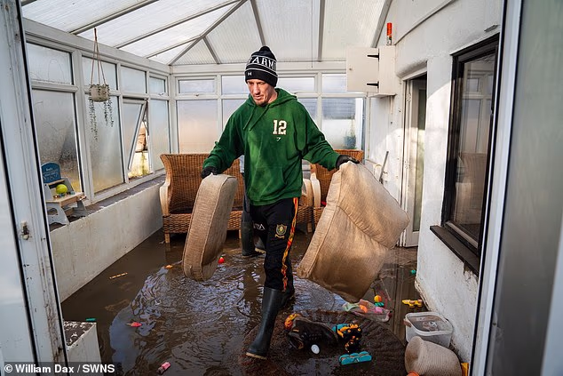 Billy Vernon limpa os danos causados ​​pelas inundações em sua casa em Axminster, Devon, após Storm Moon
