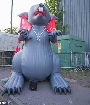 O grupo de aproximadamente 200 deixa a chama e sopra um enorme rato inflável – um consentimento de ratos gigantes que se dizem que as pilhas de lixo atacaram a segunda cidade do país como alta.