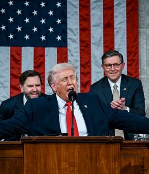 O presidente Donald Trump faz o discurso sobre o Estado da União durante uma sessão conjunta do Congresso na Câmara da Câmara, no Capitólio, em 24 de fevereiro.
