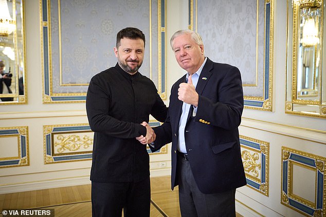 A senadora dos EUA Lindsay Graham (R) e Richard Bloomantal (L) Kiev na Ucrânia, Ucrânia, em 30 de maio de 2025, enquanto se encontrava com o presidente da Ucrânia