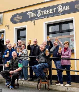 Moradores levantam uma cerveja do lado de fora de um bar de rua no vilarejo de Kiltelly, Co.