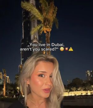Os influenciadores de Dubai têm postado vídeos idênticos enfatizando a segurança da cidade, que foram vistos milhões de vezes