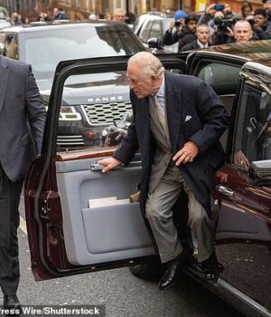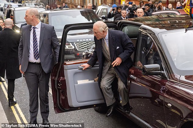 Charles se atrapalhou com o botão de seu sobretudo ao sair de seu estado Bentley no The Strand, no centro de Londres, esta tarde, sugerindo “autopreservação e um desejo de autoconforto”, disse James.
