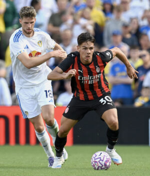 Dublin, Irlanda – 09 de agosto: Ardon Josheri do AC Milan em Dublin, Irlanda, em 09 de agosto de 2025 no Aviva Stadium com Leeds United e AC Milan com pressão de Anton Stutch durante um amistoso pré-temporada. (Foto de Charles McKillan/Getty Fig.)