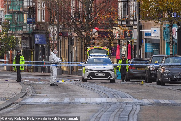 Policiais da cena do crime foram vistos concentrando-se em uma seção específica de Stamford New Road, onde destroços médicos foram espalhados pela estrada e um marcador forense foi colocado.