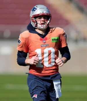 O quarterback estrela em ascensão, Drake May, levou o ressurgente Patriots a 17 vitórias, o melhor da liga, incluindo os playoffs.