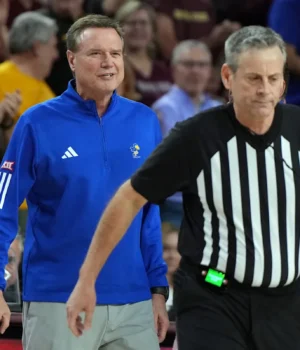 O técnico do Jayhawks foi expulso no primeiro tempo do confronto entre o número 14 do Kansas e o Arizona State, depois de vir à quadra para repreender os árbitros por uma falta ofensiva cometida contra o astro Darrin Peterson.