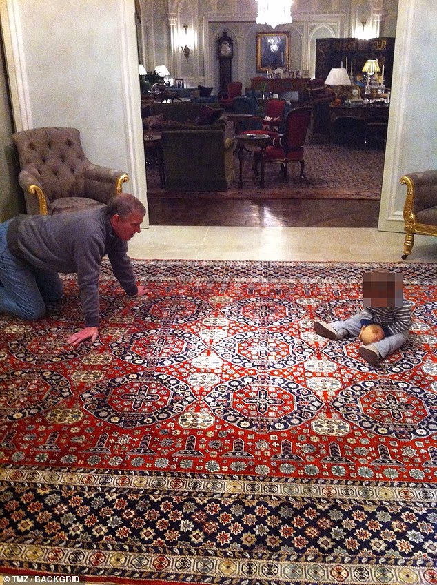 A foto bizarra, aparentemente tirada em sua grande casa palaciana em Berkshire em 2011, mostra Andrew ajoelhado e conversando com o garotinho segurando a chamada ‘bola de bub’.