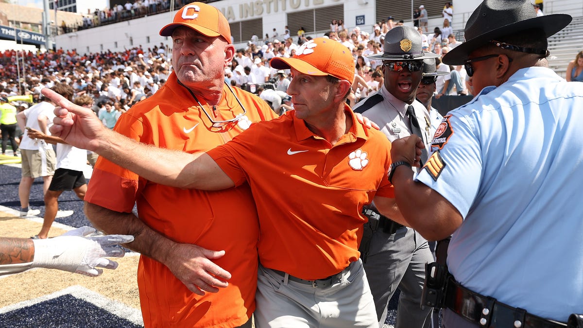 O treinador de futebol de Clemson, Dabo Swinnie, mente para a Georgia Tech